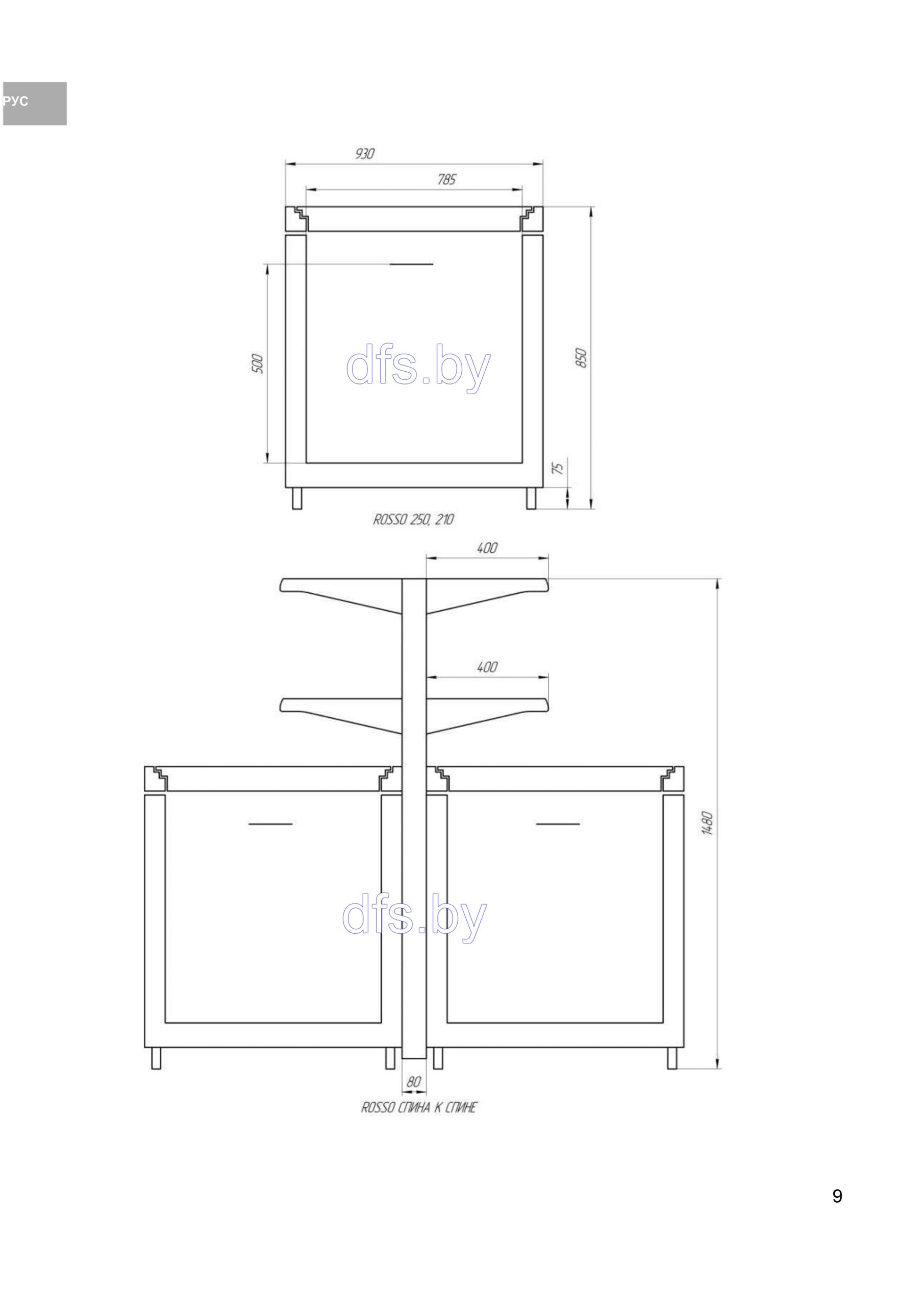 базовая полка 500 мм (2шт), 8 полок 400 мм (по 4 полки на каждую сторону), зашивки задней стенки — сплошные, узкий цоколь.