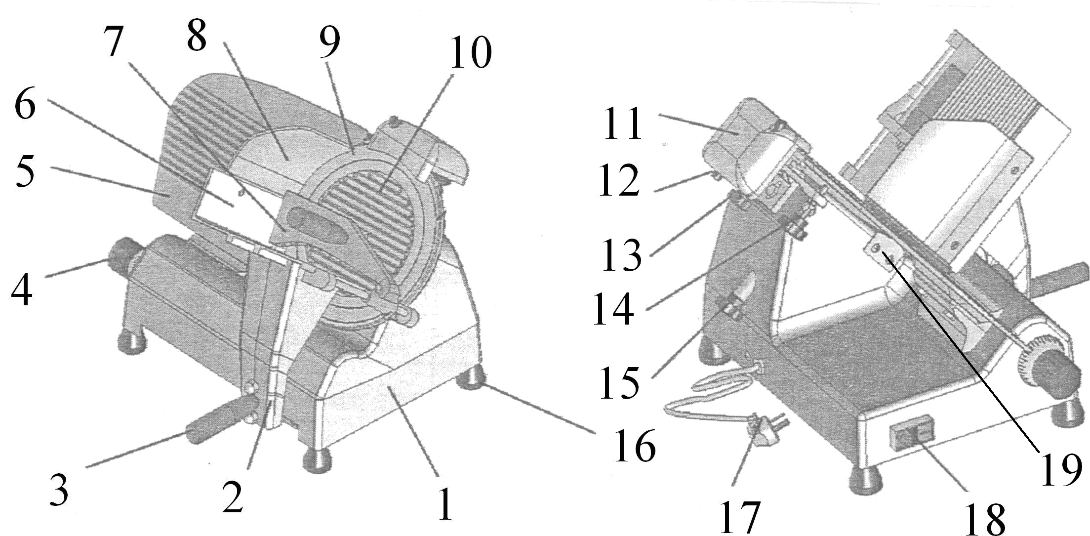 Слайсер состоит из корпуса (с электродвигателем), заточного устройства, каретки, прижимного устройства, режущего ножа, защитных экранов.
